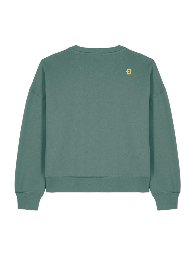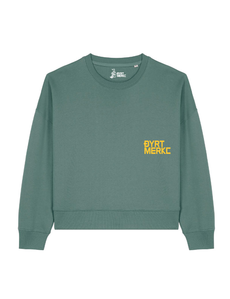 Feminin genser med malplassert logo som vekker nysgjerrighet og gir avlslappa utstråling. Litt kort, boxy/romslig og feminin passform i medium vekt bomull. Senket skuldersøm mot høye skuldre. Velg din vanlige størrelse for tiltenkt romslig passform, eller gå opp et hakk for mer oversized look