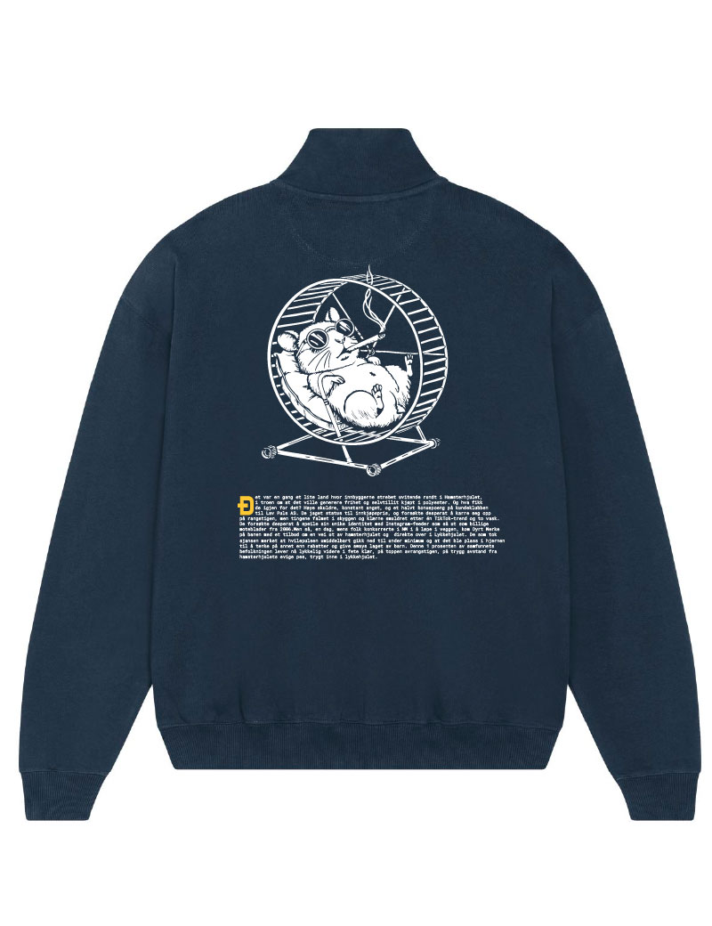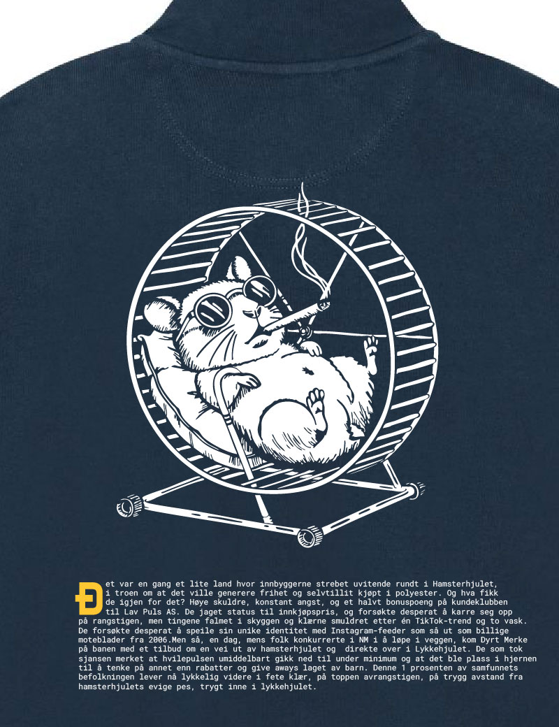 Illustrasjonen på ryggen viser omverdenen hvordan man egentlig bør angripe livet. Eventyret forteller de interesserte om hvordan man enkelt kan leve et liv i sus og dus. Genseren er OVERSIZED og BOXY passform. Bomullen er tykk og tørr og innsiden er ikke børstet (ikke fluffy inni). Høy hals med zip, men senkede skuldersømmer for lave skuldre.