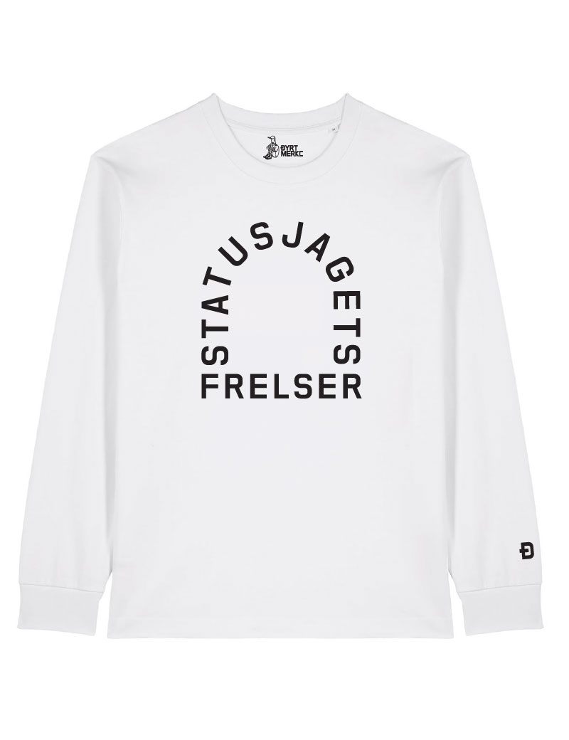 STATUSJAGETS FRELSER på brystet, utformet som himmelporten, og DYRT MERKE logo i nakken. Oversized passform med senkede skuldersømmer, mot høye skuldre. Tung kvalitet i tørr og stabil bomull, som holder bra struktur og skjuler en del av kroppens eventuelle skavanker. Velg din vanlige størrelse for oversized look.