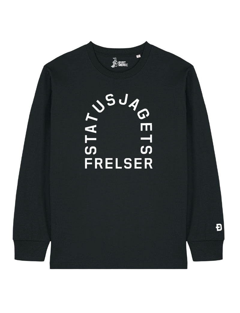 STATUSJAGETS FRELSER på brystet, utformet som himmelporten, og DYRT MERKE logo i nakken. Oversized passform med senkede skuldersømmer, mot høye skuldre. Tung kvalitet i tørr og stabil bomull, som holder bra struktur og skjuler en del av kroppens eventuelle skavanker. Velg din vanlige størrelse for oversized look.